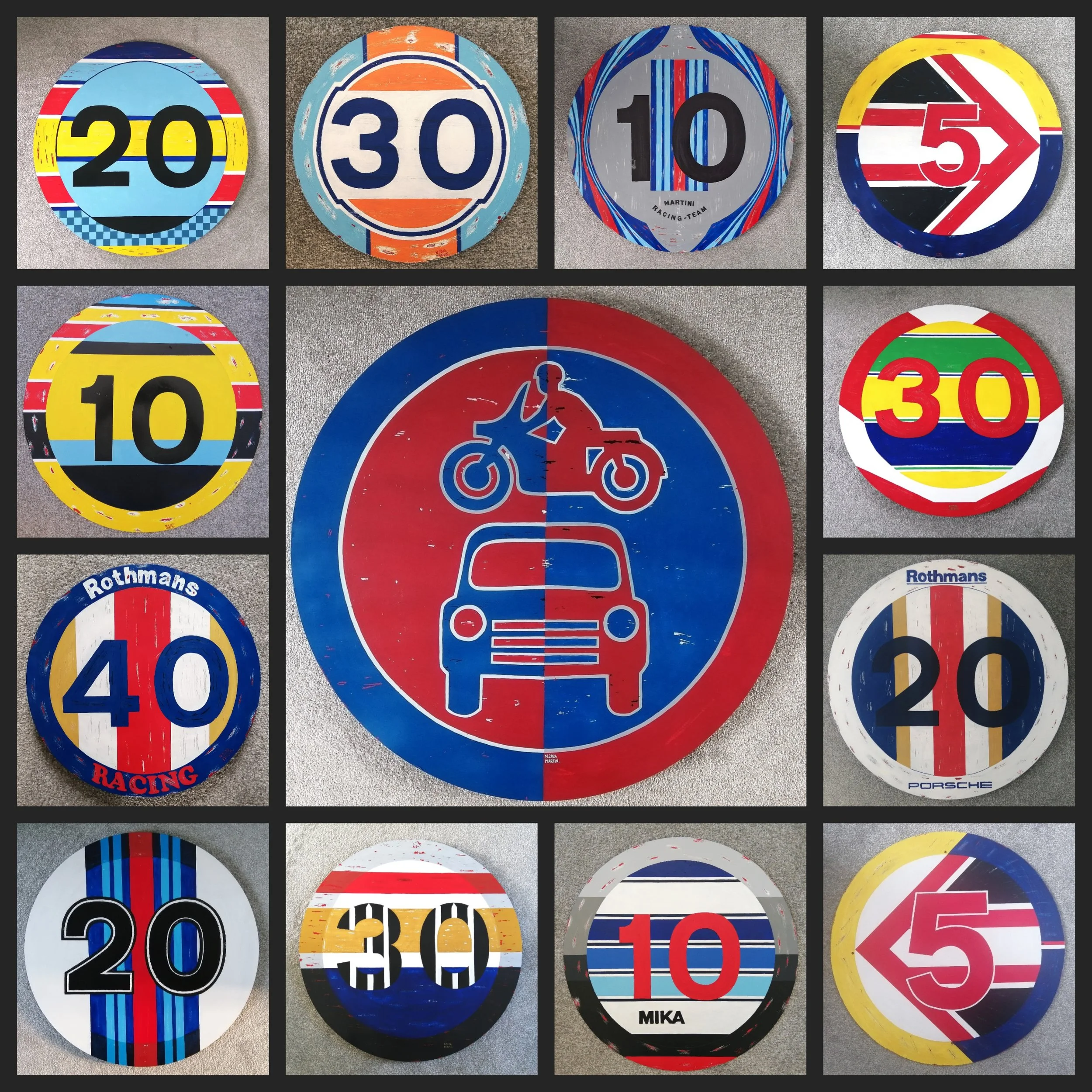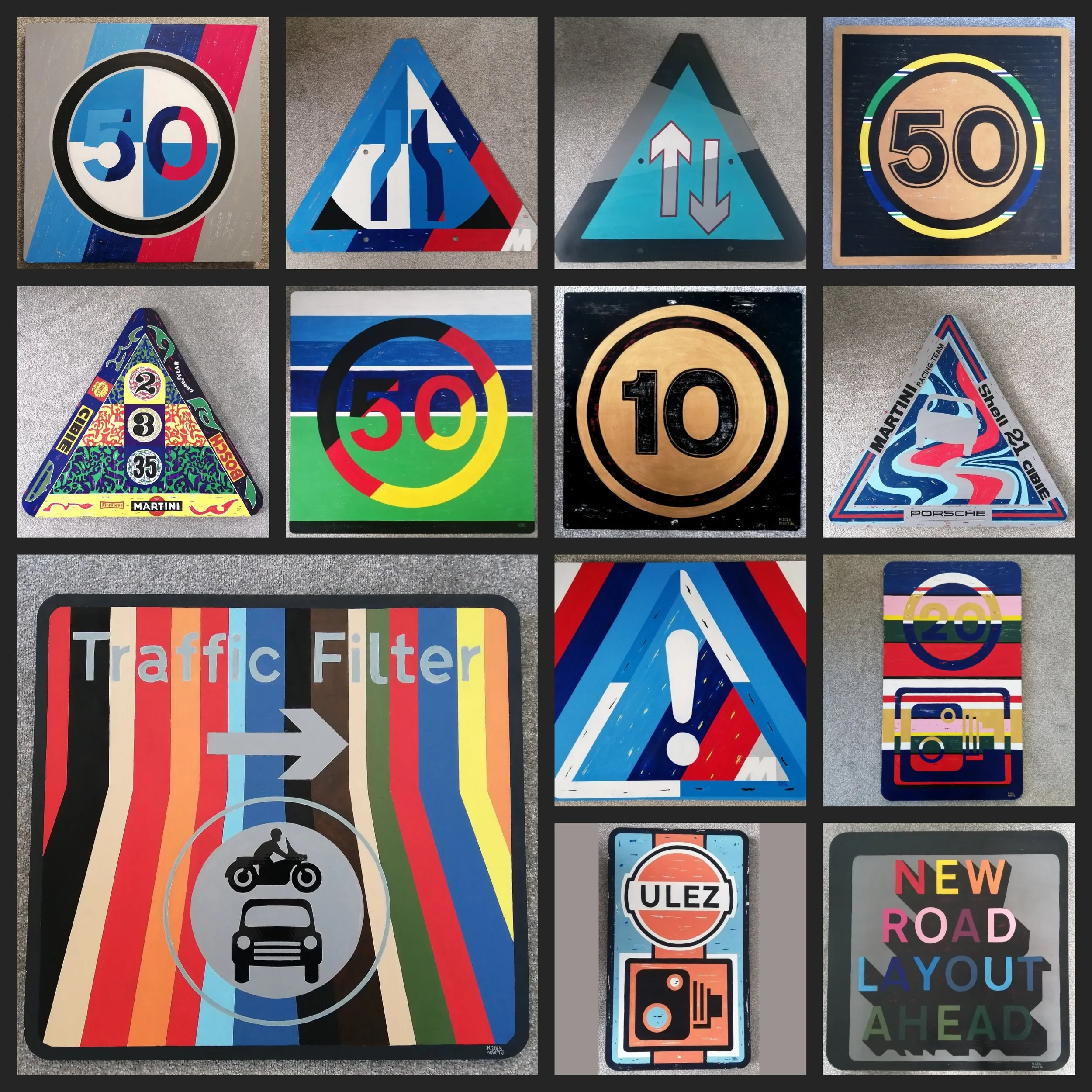 Every piece I create begins with a genuine, de-commissioned road sign, each with its own story, faded colours and signs of wear from its journey on the road. I transform these once functional objects into striking artworks inspired by Formula 1 cars, Le Mans icons, drivers helmets and legendary team liveries, or sometimes simply by a design that sparks my imagination.